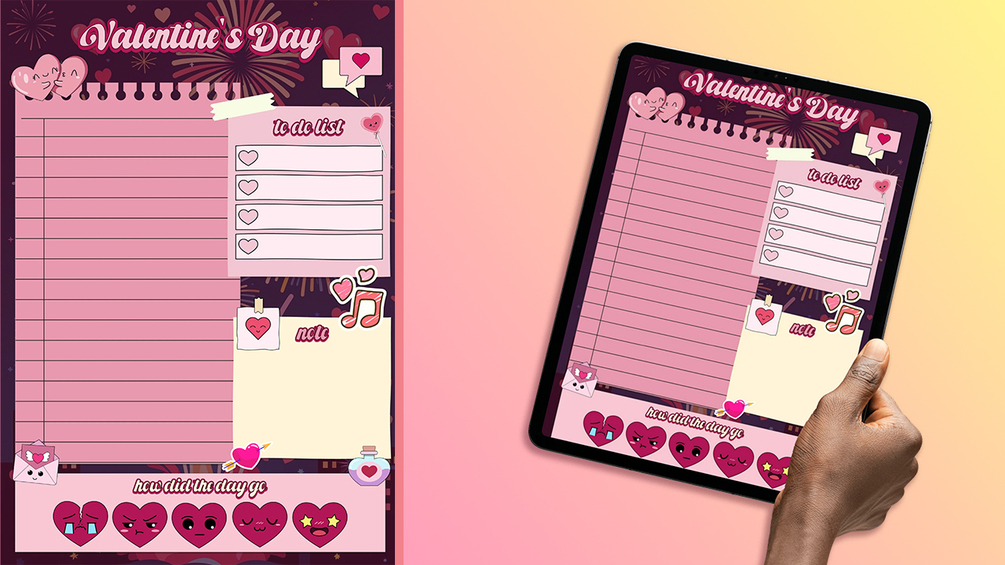Get organized for Valentine's Day with this cute and functional digital planner. It includes an hourly agenda to help you plan every moment of your special day, a to-do list to keep track of everything you need to do, and space to reflect on your day with a recap section.